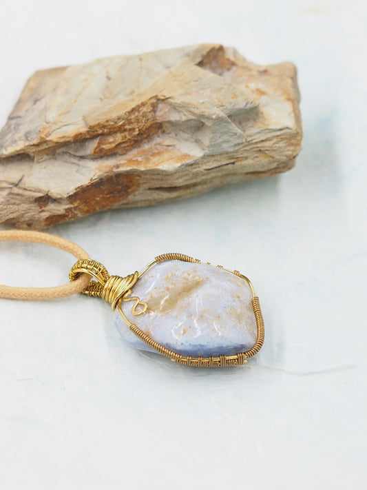 Blue Chalcedony Freeform Pendant, Hand Wrapped with Brass