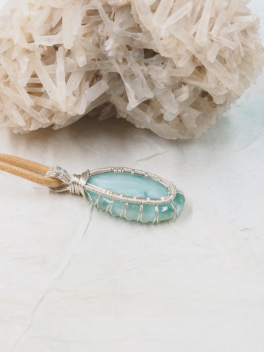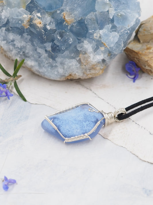 Blue Chalcedony Freeform Pendant, Hand Wrapped with Sterling Silver