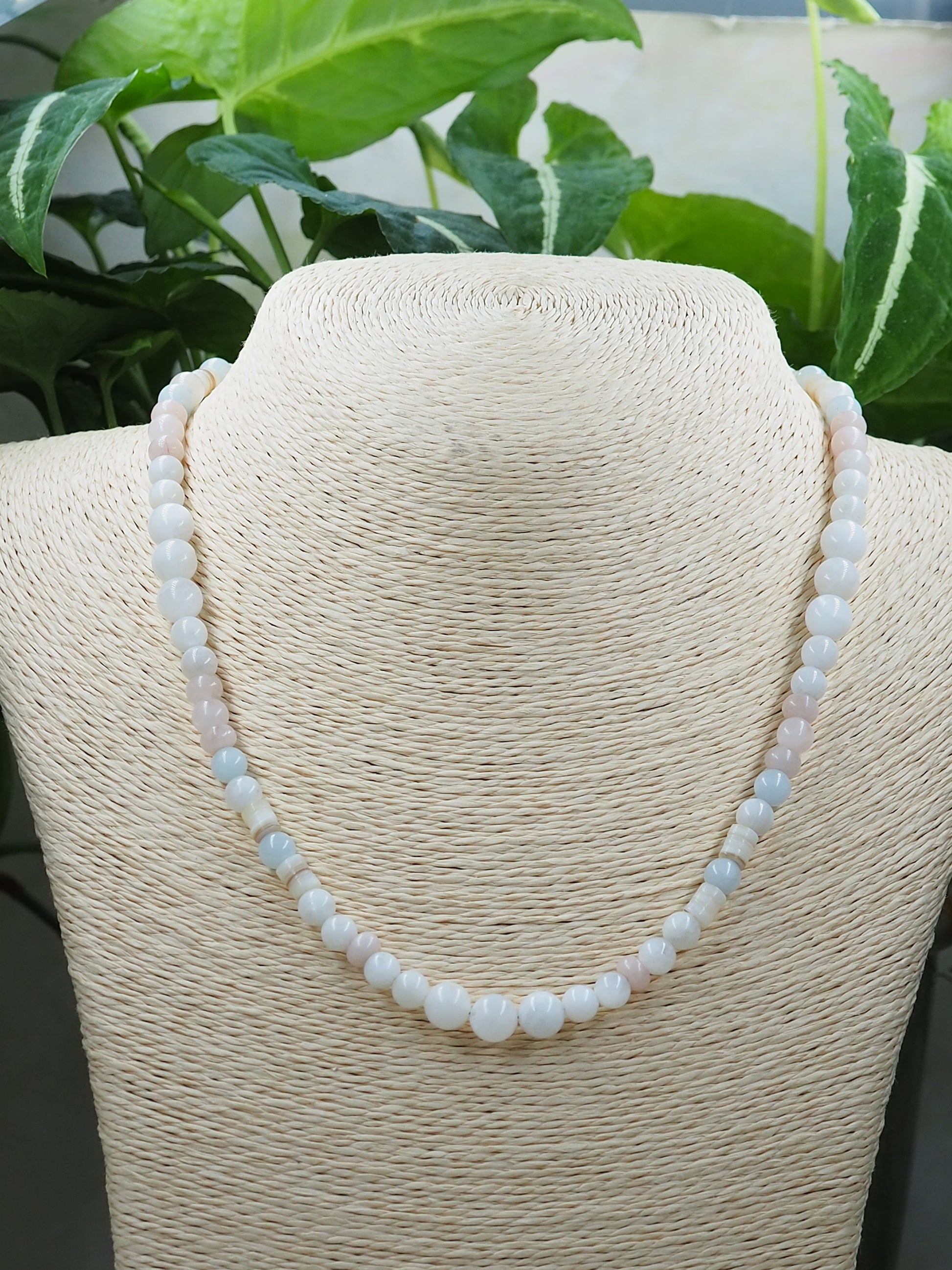 White Rainbow Moonstone, Aquamarine and Rose Quartz Hand Strung Necklace